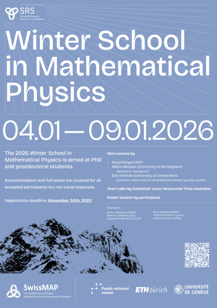 The 2026 Winter School in Mathematical Physics is mostly aimed at PhD and postdoctoral students. Master students can submit their applications as well. Accommodation and full board are covered for all accepted participants but not travel expenses.
